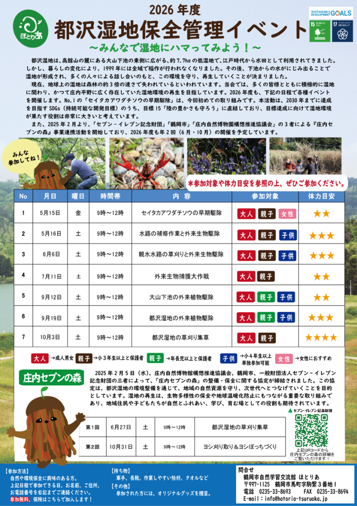 イベント案内 2026.01.212026.04.04 最新イベント情報 ヨシの火入れを開催しました! 2026.04.10 ヨシの火入れを行います! 2026.04.08 ミニ竹あかりづくりを開催します! 2026.04.05 自然クラフトづくりを開催します! 2026.04.05 マイクロプラスチックのアクセサリーづくりを開催します! 2026.04.05 4月のイベント情報 PDFをダウンロードする 2026年度 都沢湿地保全管理イベント 3月のイベント情報 PDFをダウンロードする
